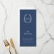 Dark navy blue and white wedding dinner menu. Edit this 4 course menu with your own meal option wording. Modern yet classical hand drawn oval leaves and monogram design. © Original oval hand drawing and design by Sarah Trett for www.mylittleedenweddings.com exclusively on zazzle.