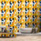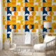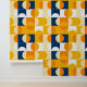 This design showcases a modern geometric pattern with circles and half-circles in shades of dark blue, yellow, ivory, and orange against a white backdrop. It's an elegant and stylish design that embodies eclectic minimalism, perfect for artistic interior designers, decor enthusiasts, trendsetters, and fans of vintage retro or abstract digital geometric motifs. This ornate yet funky hipster pattern is versatile, available on a variety of contemporary home decor items, making it suitable for enhancing the ambiance of spaces such as master or children's bedrooms, kitchens, nurseries, living rooms, women's caves, college dorms, condos, studios, or apartments.