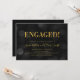 Classy engagement party invitation featuring the words "Engaged!" in faux gold foil against a dark bokeh lights pattern background. Invitation has a dark colour background back side.