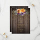 This is a beautiful rustic wedding save the date card with a dark brown barnboard, a few sets of sparkly string lights and a watercolor Sunflower Bouquet.