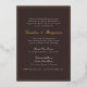 This wedding invitation features a deep chocolate brown background with a gold foil border and an oversized gold foil script couple name as the design centerpiece, with all remaining details in clean white spaced typography. The formal, classic layout is designed for evening weddings and black-tie celebrations where the stationery sets the tone before guests arrive.