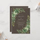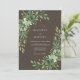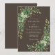 This design features a rich dark brown background that serves as a dramatic canvas for lush watercolor greenery. Verdant emerald and sage green flowers are accented by delicate leafy branches and small golden buds. The moody woodland aesthetic creates a sophisticated atmosphere perfect for an earthy event.