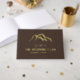 Dark brown and gold guestbook for your mountain cabin personalised with the name of your cabin or your business name in rustic gold foil letters beneath the skyline of majestic mountain tops. Cabin guestbook with mountains and rustic fonts in gold foil against a deep brown background. Rustic cabin guestbook in dark brown and gold foil for your rental home, rental cabin or guest cabin.