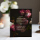 A dramatic and romantic wedding invitation featuring rich burgundy, blush and ivory florals against a deep black background.