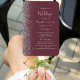 This elegant, modern wedding program fan features a dark burgundy background edged with silver faux glitter. The text appears in elegant silver grey handwriting and copperplate fonts.