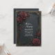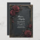Set a tone of dramatic elegance and timeless romance with this exquisite invitation design. The artwork features a rich, deep charcoal textured background that provides a moody and sophisticated canvas for your event details. Framing this dark backdrop is an ornate, antique gilded border with intricate baroque scrollwork, adding a touch of old-world luxury. The corners are lavishly adorned with arrangements of deep burgundy roses, showcasing fully opened blooms with velvety, layered petals and dark, shadowed leaves that create a striking, three-dimensional contrast. This moody aesthetic is a flawless choice for a gothic-inspired winter wedding, a romantic Valentine's Day dinner, or an exclusive evening masquerade ball. You might also select this dramatic style for a milestone anniversary celebration, a sophisticated engagement party, or a theatrical premiere event. This ornate floral border is also perfectly suitable for memorial service programs, high-end salon service menus, or luxury boutique gift certificates.