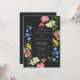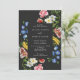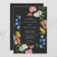 A moody wedding invitation featuring a rectangular frame overlaying large watercolor flowers in blue, yellow, white, red and pink on a charcoal backgound.