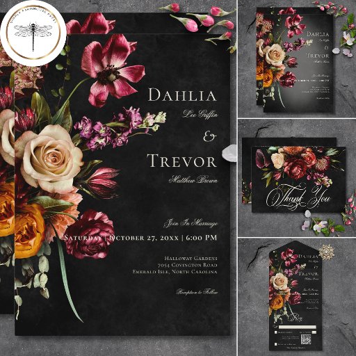 Dark Elegant Autumn Floral Wedding No Dinner All In One Invitation