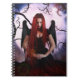 A striking fantasy-themed portrait features a mysterious woman with long, vivid red hair cascading down her chest and shoulders. She wears a deep black dress that blends seamlessly into the dark, misty background. Black angel wings extend from her back, evoking the aura of a fallen or dark angel.