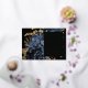 This elegant, moody wedding Save the Date card features a lush, romantic floral bouquet in navy blue with gold faux foil and glitter foliage on a black background. Customise the real gold foil text in stylish fonts on a black rectangle, and add your wedding website URL to the solid black back.