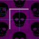 These black skulls are in a polka dot pattern, on a goth purple background.