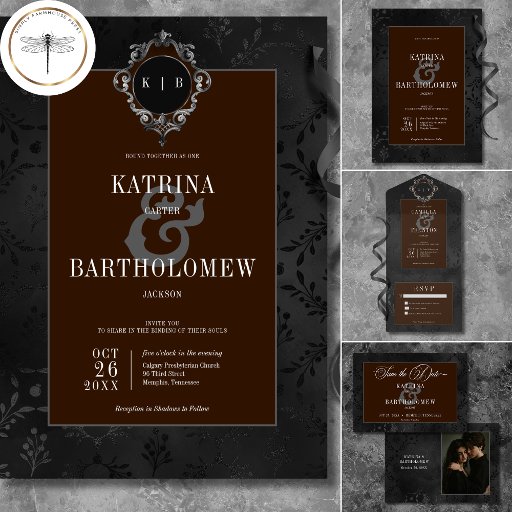 Step into a world of dark elegance with our captivating gothic wedding invitation. Set against a stunning black-on-black damask satin vintage floral wallpaper, this invitation exudes an air of mystery and timeless charm. At the top, a vintage grey, brown and black cartouche cradles the couple's first initials, adding a touch of regal splendour to the design. The text box background in rich royal blue adds a touch of colour. With an aged look that exudes sophistication, this invitation is a perfect blend of old-world allure and contemporary appeal. Embrace the allure of the past and invite your guests to witness a love that transcends time with this captivating gothic wedding invitation. Created by Simply Farmhouse Press.