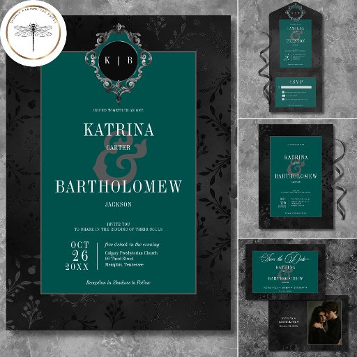 Step into a world of dark elegance with our captivating gothic wedding invitation. Set against a stunning black-on-black damask satin vintage floral wallpaper, this invitation exudes an air of mystery and timeless charm. The text box background in rich teal green adds a touch of colour. With an aged look that exudes sophistication, this invitation is a perfect blend of old-world allure and contemporary appeal. Embrace the allure of the past and invite your guests to witness a love that transcends time with this captivating gothic wedding invitation. Created by Simply Farmhouse Press.