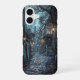 A dark and moody gothic-style digital painting, this image showcases a narrow, cobblestone street surrounded by eerie, medieval-style buildings. Twisting, leafless trees cast haunting shadows, while dimly glowing street lamps add an ominous atmosphere. The color scheme is a blend of deep charcoal grays, muted blues, and subtle amber highlights. The textures are rich, with detailed stone walls and aged wooden doors, enhancing the gothic horror esthetic. Wisps of mist creep along the ground, and the distant windows glow faintly, suggesting hidden stories within. This piece evokes the ambiance of Victorian-era horror, reminiscent of classic gothic literature.