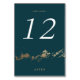 This event table number card features an abstract painted mountain in faux gold. The table number is highlighted in a large and elegant font for a sophisticated feel. There is an additional place for a table name. The faux gold foil adds a perfect painterly touch. The dark green background can be customised to match your wedding colours. The front and back of the table number cards repeat the same information so they can be placed in the centre of a table and viewed from either side.