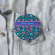 A pretty round Button or Badge, with a pattern of bright flowers in purple, turquoise, pink and orange on a dark green background, from a handpainted paper collage by Judy Adamson. You can easily change the background colour, if you wish, by using the Edit button.