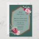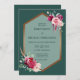 A fun and stylish boho invitation featuring a gold geometric frame against a dark green background. The frame is accented by burgundy roses, pink peonies and feathers. Your names and details appear in a restrained and sophisticated serif font. The back features your names against a full colour background.