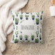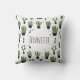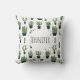 A personalised pillow with a rustic western flavour. Designed with a bunch of cute green cactuses in a repeating pattern. Specifically, green coloured prickly cactus, in all kinds of shapes and sizes, each sitting in its own dark blue flower pot. Little decorative triangles in between them. Whimsical fun illustration.