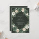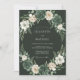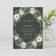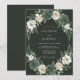 This design features a rich palette of deep forest green and soft ivory, creating a sophisticated and moody atmosphere. Lush roses and delicate ranunculus blooms are artfully arranged with textured fern fronds and silver dollar eucalyptus leaves. The dark background emphasizes the creamy floral tones for a romantic and elegant aesthetic. This aesthetic works beautifully for a formal winter or late autumn event.