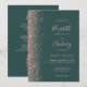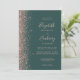 The left-hand edge of this elegant modern wedding invitation features a rose gold faux glitter design. The customisable text combines pale rose-coloured handwriting, copperplate and italic fonts on a dark emerald green background. The reverse side provides space for wedding details on a solid dark green background, along with a QR code guests can scan to visit your website and RSVP, which saves the cost of printing and mailing separate RSVP cards.