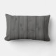 An outdoor lumbar pillow with a photograph of dark grey barn boards or wooden siding.