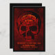 Custom dark skull Halloween party invitation. Grunge texture look with black border. Deep crimson blood red colour with orange accents. Menacing skull graphic with the text "Halloween Party." Cool and frightening red and black Halloween bash invite.