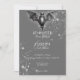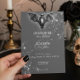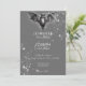 Step into the enchanting realm of our Halloween wedding invitation, where love meets glamourous mystery in a spellbinding celebration. Against a backdrop of bewitching charcoal grey, this invitation sets a dazzling yet dark tone for your special day. A softly glittered bat with wings spread sits atop your wedding details, surrounded by a cluster of sparkling loose diamonds, adding glam to the dark beauty of the design. Capture the spirit of Halloween and set the stage for a wedding that's as hauntingly beautiful as it is unforgettable. Choose our Halloween wedding invitation to embark on a journey into the shadows and create memories that will last a lifetime. Created by Simply Farmhouse Press.