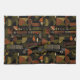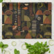 Sophisticated mid-century geometric pattern kitchen towel featuring layered circles, arches, triangles, and rectangles in forest green, burnt orange, ochre, and cream on a black background. Rich textures and retro-modern shapes create a bold design ideal for Bauhaus lovers, vintage décor fans, and anyone drawn to moody modern style.