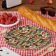 Sophisticated mid-century geometric pattern paper plate featuring layered circles, arches, triangles, and rectangles in forest green, burnt orange, ochre, and cream on a black background. Rich textures and retro-modern shapes create a bold design ideal for Bauhaus lovers, vintage décor fans, and anyone drawn to moody modern style.