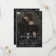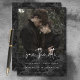 This wedding save the date card design features a dark, moody theme that is simple, yet stunning. A dark charcoal black damask background featuring skulls in a Victorian design is the perfect canvas for your favourite couple photo. The simple details appear in white text against the dark background. Unique and elegant, this design can be used for any season. Created by Simply Farmhouse Press.