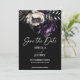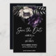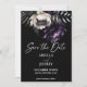 Dark moody boho elegant gothic save the date editable template invitation instant digital download, black purple peonies on dark background save the date invitation details and RSVP QR code at the back