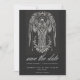 This wedding save the date card design features a dark, moody theme that is simple, yet stunning. A cloaked angel in white gothic line drawing sits on a two-toned charcoal background. Unique, mysterious and elegant, this design can be used for any season. Created by Simply Farmhouse Press.