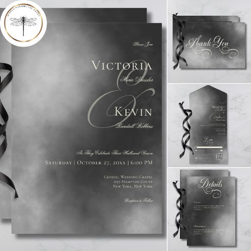 Unveil the mystique of your love story with our spellbinding dark romance wedding invitation. This simple yet elegant design features a midnight black background with a mysterious veil of wispy fog drifting across the text. The design evokes the essence of timeless romance and mystery. The dark elegance is further accentuated by the creamy moon white text. This design is an artful fusion of beauty and drama, promising to set a bewitching tone for your special day. Choose this design to create a wedding that's as unique and unforgettable as your love. Created by Simply Farmhouse Press, it is part of the Dark Moody Midnight Black Fog Wedding suite.