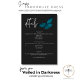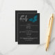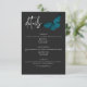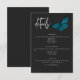 This wedding details card design features a dark, moody theme that is simple, yet stunning. A dark charcoal black background is the perfect canvas for a single teal blue moth, its wings spread for flight. Unique and elegant, this design can be used for any season. Created by Simply Farmhouse Press.