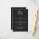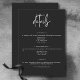This wedding details card design features a dark, moody theme that is simple, yet stunning. A dark charcoal black background is the perfect canvas for simple, white text. Unique and elegant, this design can be used for any season. Created by Simply Farmhouse Press.