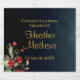 Delicate, sophisticated and full of elegance graduation party sparkling wine label with a simple, yet beautiful floral arrangement on the bottom left corner featuring gorgeous red flowers and complimented exquisite green botanicals. Elegant gold customisable typography for the event details on a midnight blue gradient for background. Congratulations graduate!
