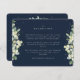A dark navy flat wedding reception enclosure card featuring an edging of hand painted snowberries and eucalyptus on the front and a wreath on the back of the card. All text is fully editable and the scattered dots on the front and back can be deleted before ordering if you would prefer. This card is available with alternative botanical designs, in a portrait format, and in different colours. Please view the Collection in my store to see all options and coordinating items.