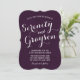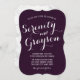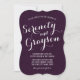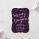 This beautiful elegant wedding invitation features a dark plum purple marble background with crisp white script and block fonts. The back of the card features a grey marble background.