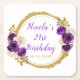 Beautiful birthday coaster with a dark purple and gold faux glitter frame with floral flower arrangements. Perfect for a birthday party. The words can be changed to suit your own details or requirements