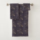 Dark purple towels and a washcloth feature a delicate pattern of golden shooting stars. The towel set is neatly arranged on a metallic rack.