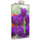 Dark purple tulips on a sunny day in the garden hip flask