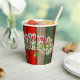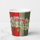 Beautiful, unique, classic, trendy, pretty and decorative Christmas holiday greeting paper cups with a classic Holiday dark red, forest green, and white coloured 'Merry Christmas' quote text on a rustic weathered wooden country cottage farmhouse style planks pattern background.
