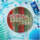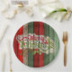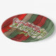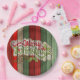 Beautiful, unique, classic, trendy, pretty and decorative Christmas holiday greeting paper plate with a classic Holiday dark red, forest green, and white coloured 'Merry Christmas' quote text on a rustic weathered wooden country cottage farmhouse style planks pattern background.