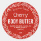 Dark coloured kraft paper under a white wreath of leaves for homemade cherry scented bath and body products such as soap and body butter.