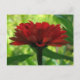 This postcard features a single dark red zinnia flower. The petals are a deep scarlet and are set off by the plant's green leaves and the luminous green and yellow foliage bathed in sunshine.