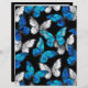 Realistic, blue and white butterflies seamless pattern on black background.