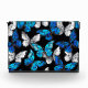 Realistic, blue and white butterflies seamless pattern on black background.