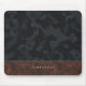 Rugged and masculine camouflage pattern and faux leather personalised name mouse pad. The design features a dark slate grey camouflage pattern paired with brown faux stitched leather to create a stylish rugged look. Personalise with name. Camouflage artwork by Moodthology.