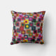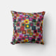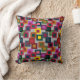 This throw pillow has a geometric design of squares inside squares in brown, black, brick, yellow, teal, green, purple, gold, pink, red, grey on a field of lighter grey.