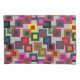 This pillowcase has a geometric design of squares inside squares in brown, black, brick, yellow, teal, green, purple, gold, pink, red, gray on a field of lighter gray.